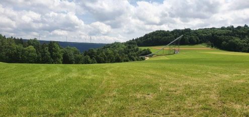 Nach der wohlverdienten Rast im Franz-Keller-Haus wandern wir auf teilweise schmalen und steilen Waldwegen bergab, vorbei an der Degenfelder Skisprungschanze. Hier verlassen wir nun die „Löwenpfadrunde“ und wandern direkt zurück zum Ausgangspunkt Nenningen.