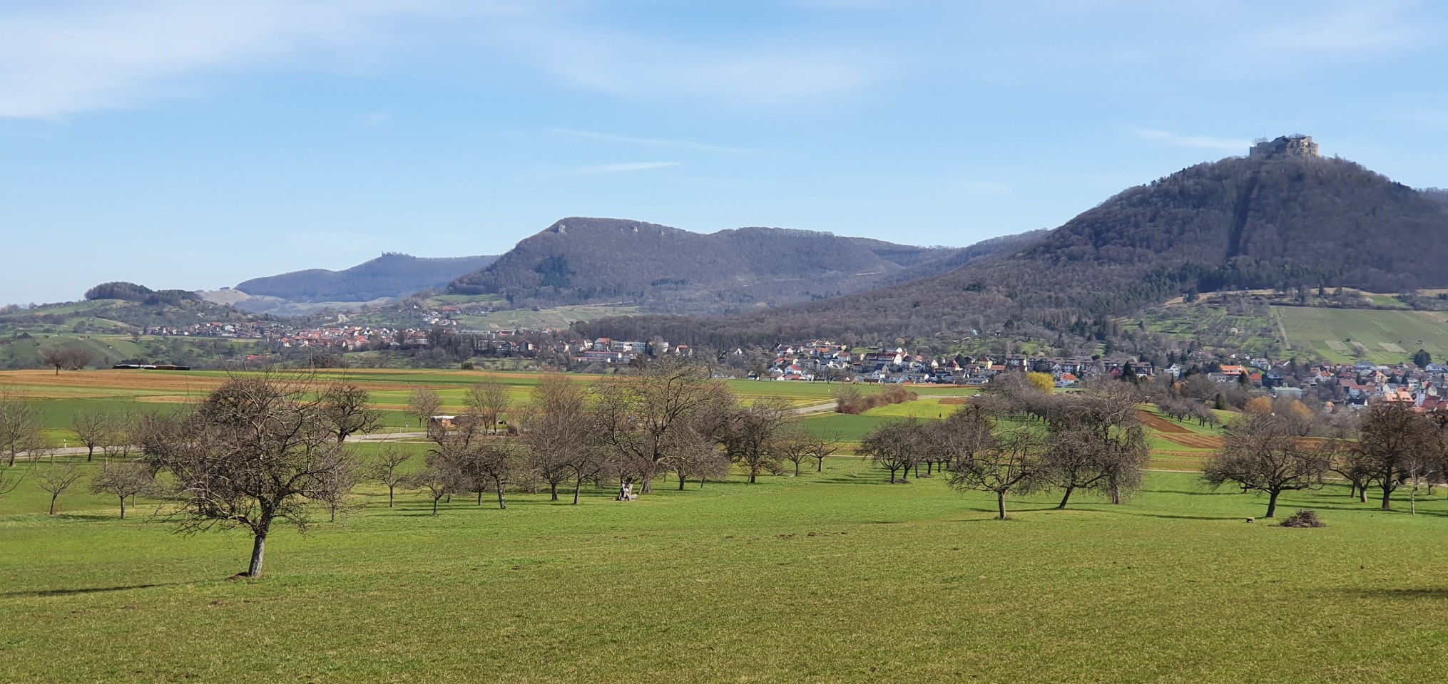 Neuffen, Blick zum Albtrauf mit der Ruine Hohenneuffen